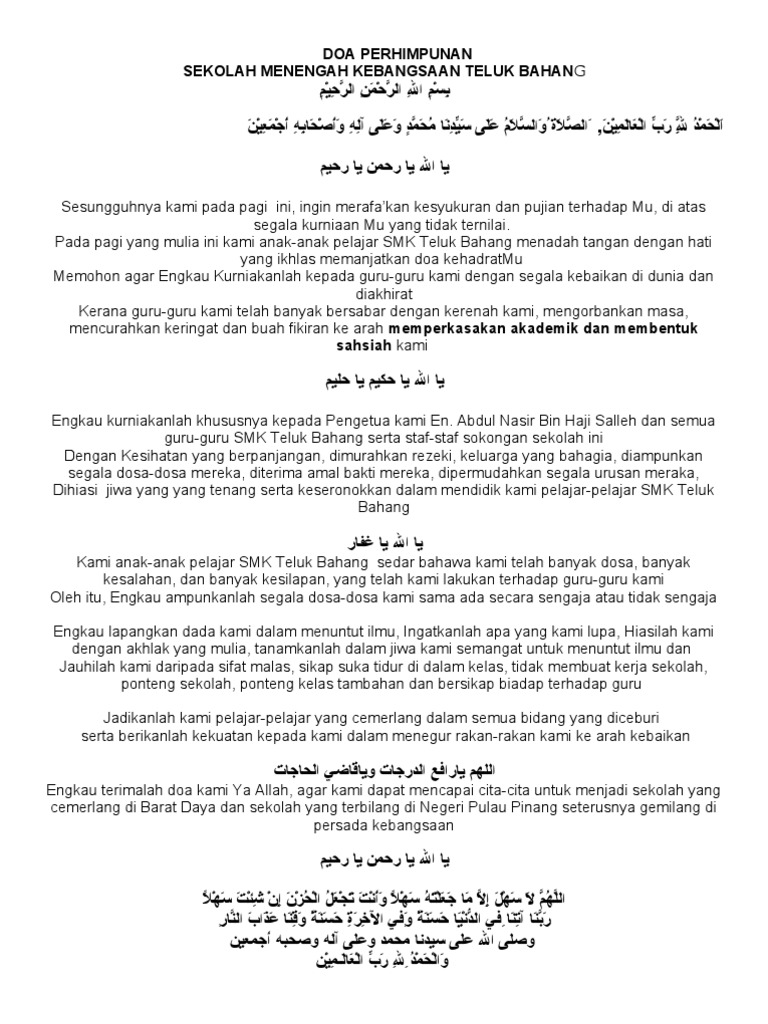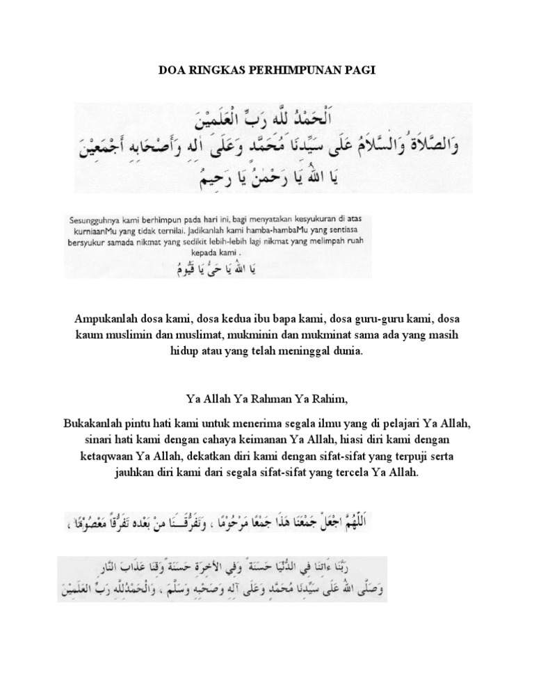 Contoh doa majlis perhimpunan pagi di sekolah. Berikut kami kongsikan beberapa versi teks ataupun skrip perhimpunan rasmi mingguan dalam dua versi Bahasa Melayu dan Bahasa Inggeris untuk murid. Bacaan Doa Perhimpunan Versi 2 Ya Allah Ya tuhan kami.