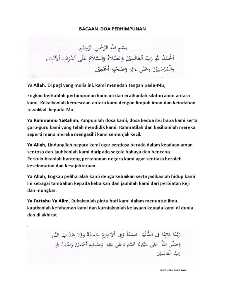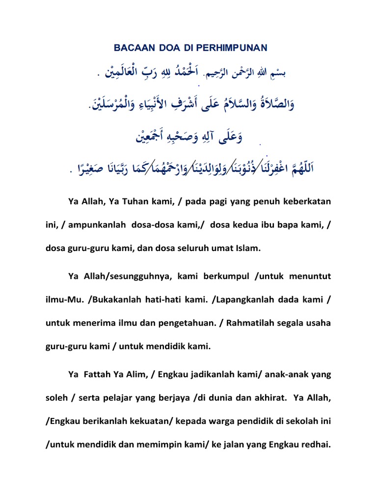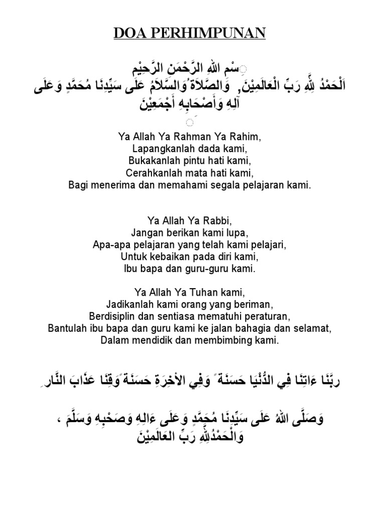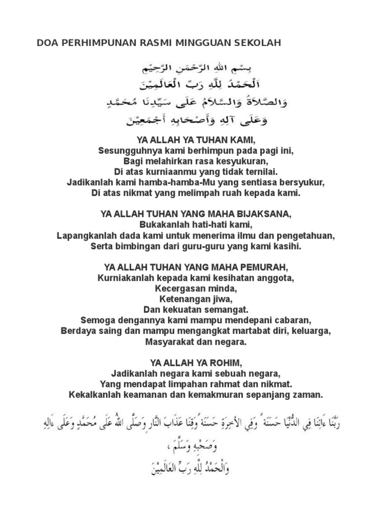 DOA PERPISAHAN SEKOLAH ميحالر نحالر هللا مسب ديزم ئافكيو همعن افوايدح يملاعلا بر للدم. The part that you usually hear in Malay is usually recited in Arabic in other events. Justeru berkati dan rahmatilah perhimpunan kami ini.
