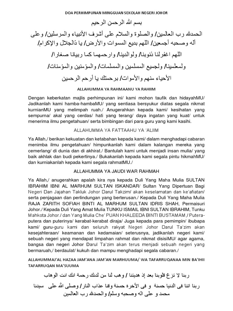 Doa Perhimpunan Sekolah Negeri Johor by knizam13. Kami sebagai hambaMu yang Engkau redhai. Ya Allah di pagi yang berkat inikami menadah tangan memohon kepada Muampunilah dosa-dosa kamikedua ibu bapa kamikaum keluarga kamiguru-guru kami juga muslimin dan mislimatmuminin dan muminat samada yang masih hidup mahupun yang telah meninggal dunia.